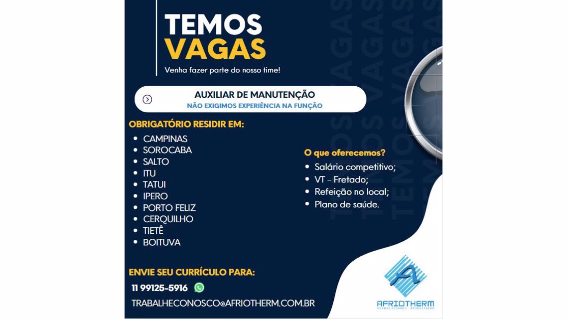A empresa AFRIOTHERM está em busca de um talentoso Auxiliar de Manutenção para se juntar à nossa equipe dinâmica. Se você é apaixonado por manutenção de ar condicionado, é proativo, tem vontade de aprender e é flexível com horários, queremos conhecê-lo!